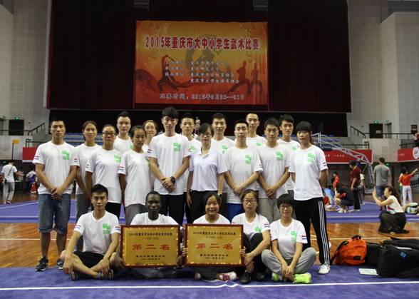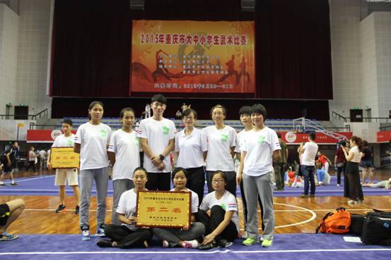 重庆市大中小学生武术比赛,于2015年5月28日—31日在重庆师范大学大学城校区体育馆举行,我校武术队不负众望,从众多比赛队伍中脱颖而出,以六个单项冠军、三个单项亚军、五个单项季军的骄人成绩,分别获得女子、男子丙组团体总分第二名,男女综合团体总分第一名。