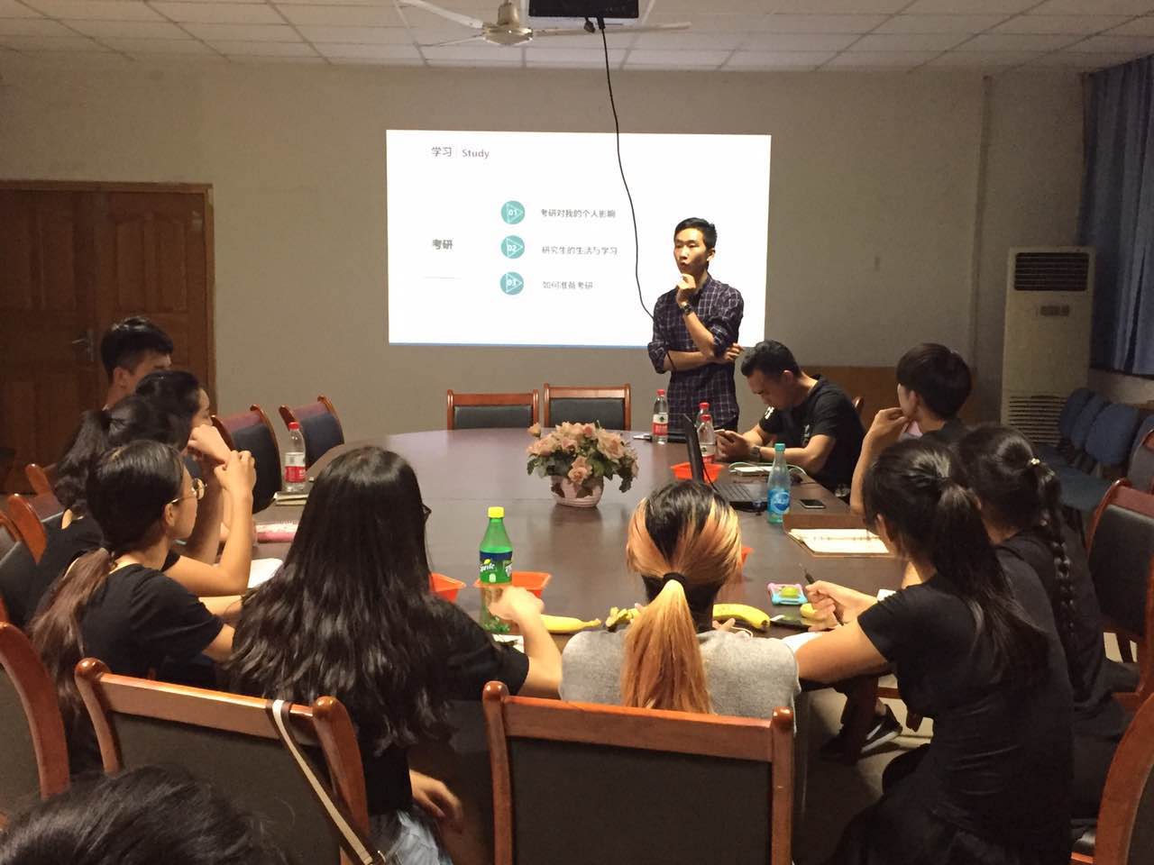 活动在yl23455永利集团二楼会议室举行,2014级大三年级及部分大一大二的有考研意向的同学悉数到场,陈杭川同学在云南大学读研期间,学习实践表现优秀,曾受邀做主题演讲,本次活动陈同学结合自己考研历程、研究生学习生活深入简出的为大家做了主题报告,并同大家交流探讨,鼓励同学们积极考研,认真训练,不断提升自己,做一个对自己负责,有社会有用的人。