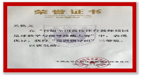 本次大赛是为了深入学习习近平总书记在全国教育大会上讲话精神,落实《国务院办公厅关于强化学校体育促进学生身心健康全面发展的意见》(国办发﹝2016﹞27号)和《教育部等6部门关于加快发展青少年校园足球的实施意见》(教体艺﹝2015﹞6号)文件精神,发挥教指委学校引领示范作用,不断促进学校体育改革中“教会、勤练、常赛”机制的落实而举行的一次全国高校体育教师校园足球教学与指导技能大赛。比赛分为竞训组和教学组,测试内容均为网络评审和现场测试两个环节,其中网络评审项目为教学设计与教学实践,要求网络上传20分钟无删减的教学视频;现场测试为5x20米折返跑、90秒跳绳、28米传准、绕杆运射、1分钟颠球等体能与专项技能项目。比赛异常激烈,精彩纷呈。我校yl23455永利集团关钦文老师作为高水平足球队助理教练参加了竞训组的比赛,并获得三等奖。