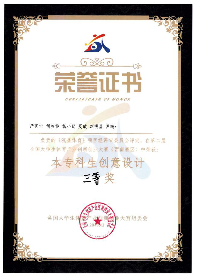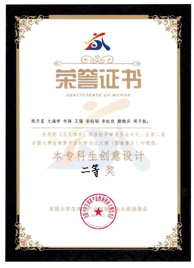 为激发广大学生对体育产业的创新热情,增强对体育产业创业自信心,我院积极动员和组织学生参加大赛。本届大赛共分四个大区开展大区竞赛。最终,我校参赛队伍从西南赛区本专科创意设计组30支参赛队伍中脱颖而出,喜获佳绩。由17体育教育专业陈月星、文海学、何锋、王强、安钰钢,17财务管理专业李虹欣、颜晓庆和18市场营销专业周子航组成的团队“五九体育”获本次大赛西南赛区本专科创意设计组二等奖;由18体育教育专业严国宝、刘明星和17国际商务专业胡珍艳、杨小勤、夏敏、罗晴组成的团队“流星体育”获本次大赛西南赛区本专科创意设计组三等奖。