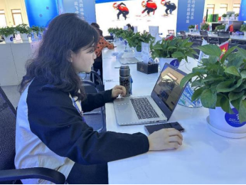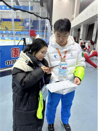 甘立琼同学核对赛事信息李俊龙同学引导混合区记者采访