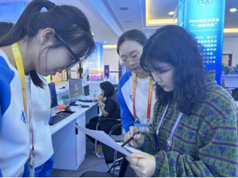 于倩懿同学与志愿者核对赛程信息