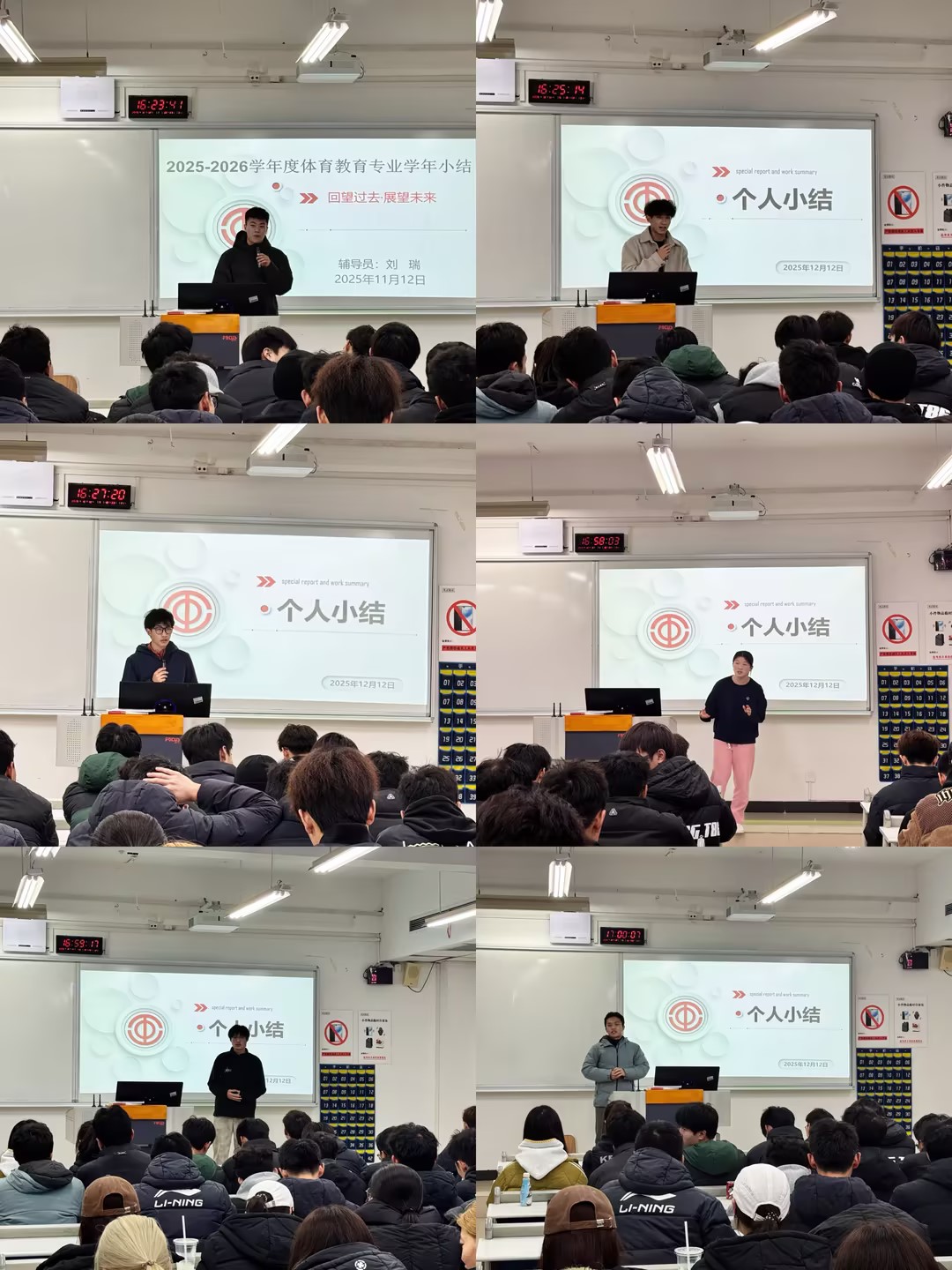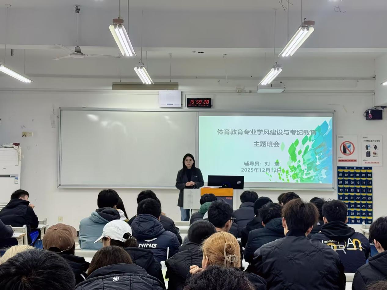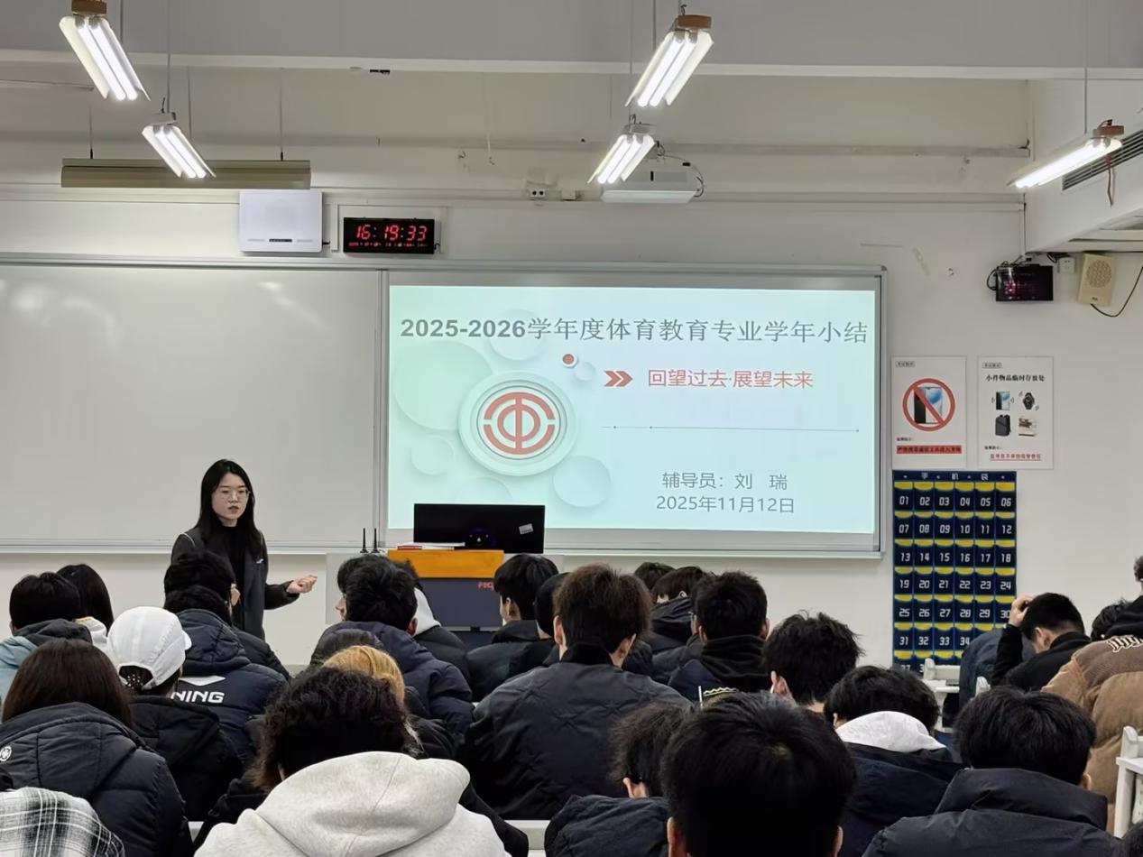 为持续强化学风建设、严肃考试纪律,系统总结本学年教育教学成果,引导学生明确未来发展方向,2025年12月12日下午,2025级体育教育专业组织开展了“强学风、正考纪、促成长”主题班会暨学年总结表彰大会。本次班会由辅导员刘瑞老师主持并主讲,专业全体学生参与。