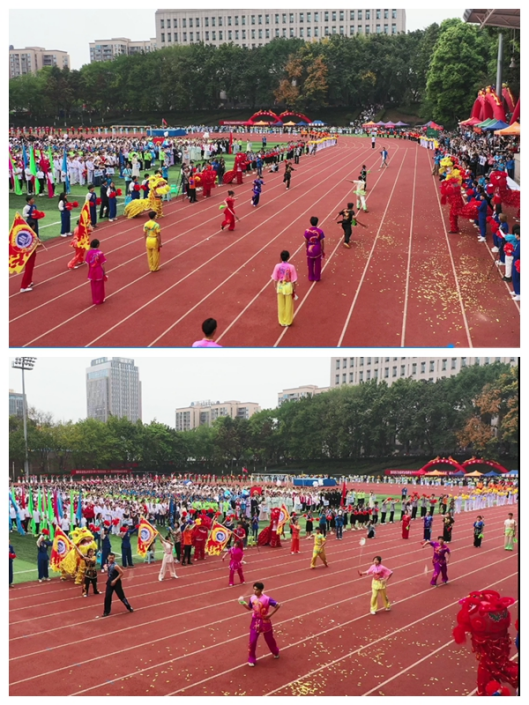 “醒狮贺校庆,武术扬校威......”伴随着广播员激昂的解说词,体院学生为全校带来了创意十足的舞狮、武术表演,引得场内外不时爆发出阵阵的掌声和喝彩声。雄狮威武的身姿展示了工商人的勇敢与力量,武术矫健的动作代表着体育人的朝气与激情。