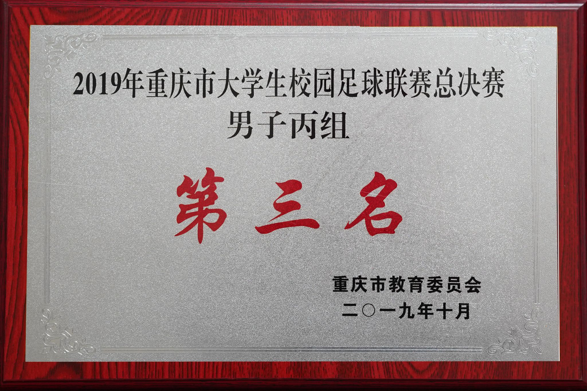 荣获2019年重庆市大学生校园足球联赛总决赛男子丙组第三名