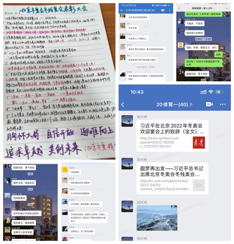 全院青年感悟深刻,发表自身感言、书写心得体会。并表示作为新时代中国青年和新时代中国体育人,将以冬奥为契机,心系祖国、志存高远,以为国争光为己任,以为国建功为光荣,保持知重负重、直面挑战的昂扬精神,苦干实干,坚韧不拔,与祖国和人民一起向未来!