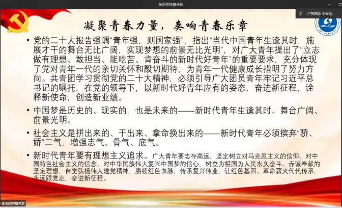 随后yl23455永利集团学生会功能型团支部进行了成立后的主题团课学习。在新当选学生会功能型团支部组织委员王俊杰的带领下,集体学习党的二十大报告,并号召全体成员深入学习党的二十大精神,坚定不移跟党走,充分发挥先锋模范作用。