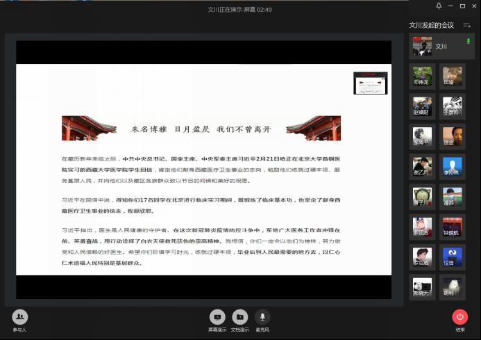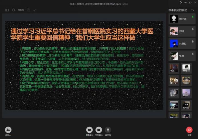 同人民一道拼搏、同祖国一道前进,服务人民、奉献祖国,是当代中国青年的正确方向。好儿女志在四方,有志者奋斗无悔。此次线上团日活动中,我院各团支部齐心准备积极参与,团员们深刻理解感悟了习近平总书记给在首钢医院实习的西藏大学医学院学生重要回信精神。大家积极探讨,畅所欲言,决心拼一个艰苦奋斗的青春,为人民作奉献的青春。通过此次“青年有担当,国家有希望”团日活动,大家充分了解了习总书记对青年寄予的希望和行动准则,也深刻认识到此时此刻青春是用来奋斗的,有信念、有梦想、有奋斗、有奉献的人生才是有意义的人生。打好基础,为人民服务,是青年最有价值的作为。