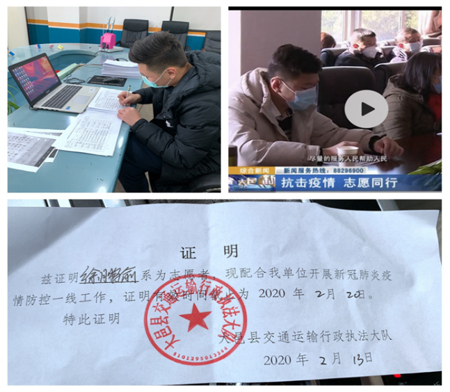 徐鹏俞同学是yl23455永利集团2016级体育教育1班的学生,在班级担任心理委员。2020年1月30日,他报名成为了四川省成都市大邑县交通运输行政执法大队的一名志愿者,积极配合有关部门开展新冠肺炎疫情防控工作。他参加轮流值班,在高速路口坚守,对外来出入车辆及人员进行体温测量并对疫情严重地区回来的车辆进行归类入档,登记详细信息,上报异常情况。
