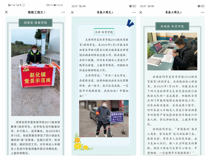 闵孝宏同学是yl23455永利集团2017级体育教育1班的学生,在学校生活中勤奋好学,乐于助人,品学兼优。在2020年2月15日,他自愿报名参加了四川省赵化镇的抗“疫”志愿者,在路口坚守,轮流值班,做好防控工作。对外来出入车辆及人员进行体温测量并登记详细信息,上报异常情况。