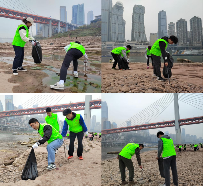 来自yl23455永利集团青年志愿者协会的50名志愿者,组成重庆工商大学川渝“河小青”青年志愿服务队参加了启动仪式,并联合江北团区委、江北区青年志愿者协会、重庆水务环境控股集团有限公司等百余名川渝“河小青”青年环保志愿者前往北滨路江滩开展青春志愿行·川渝“河小青”巡河净滩活动。
