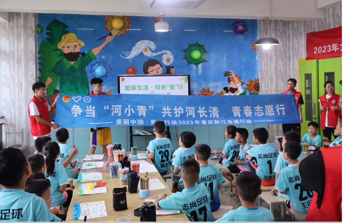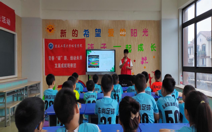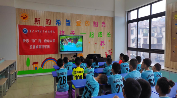 成都大运会将于7月28日至8月8日在成都举办,杭州亚运会、亚残运会将于9月至10月在杭州举办。实践团以大运会、亚运会体育赛事为契机,向孩子们宣传赛事“绿”知识,观看运动会主题宣传片,介绍绿色环保理念、场馆建设中环保材料运用、赛事期间废弃物回收再利用设计、公众低碳节能化观赛体验等内容,引导孩子们走上低碳环保之路,培养环保意识,弘扬绿色文明,构建美好家园,让“绿色行动”成风尚。