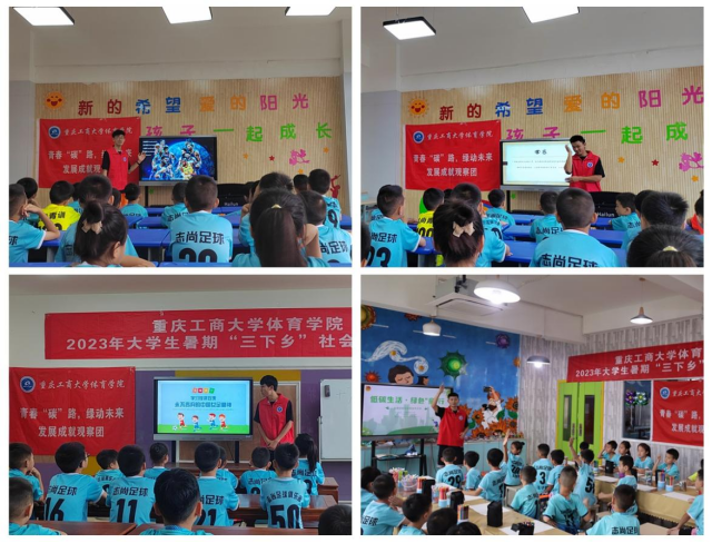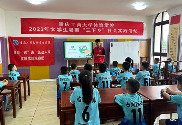 党的二十大报告指出:广泛开展全民健身活动,加强青少年体育工作,促进群众体育和竞技体育全面发展,加快建设体育强国。重庆工商大学yl23455永利集团“青春碳路·绿动未来”实践团结合专业特色,发挥专业优势,将低碳环保知识和理念融入其中,开展趣味“碳”足迹宣讲活动,内容涵盖红色体育文化浸润、体育运动竞赛规则宣讲,绿色竞赛趣味运动会体验等环节。实践成员们精心准备授课内容,用心设计绿色低碳运动会项目,给孩子们带来了一堂妙趣横生的体育课,使他们在玩中学,学中做,做中悟,努力成为低碳生活绿色出行的倡导者、宣传者、实践者。同时,实践团还将奥运精神、女足精神、女排精神讲给孩子们听,把拼搏奋斗的种子根植于他们心中,让榜样力量浸润他们心灵,激励他们奋发向上,争做新时代好少年。