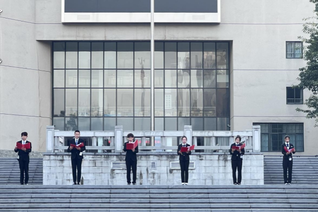 7时30分,迎着和煦的朝阳,国旗护卫队迈着整齐划一、铿锵有力的步伐,昂首挺胸地护送国旗入场。伴随着雄壮的国歌,鲜艳的五星红旗冉冉升起、迎风飘扬。全体师生集体行注目礼,共同表达对先烈的追思与敬仰之情。