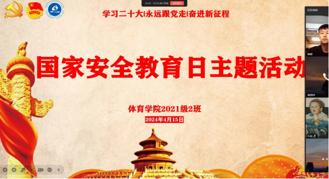 各团支部团员青年深入学习习近平总书记提出的“总体国家安全观”与“国家安全对于国家及民族的重要性”的概念和内涵,学生会主席团成员陈毅从“国家安全基本常识”、“国家安全成就展”、“危害国家安全行为”、“如何维护国家安全”、“维护国家安全,我们该怎么做”五个方面向同学们详细讲解国家安全教育方面的知识,增强同学们自主维护国家安全、守护国家秘密的意识和爱国意识,引导同学们重视国家安全,增强民族自自信,把爱国之心转变为报国之行。同时,也分享了很多国家安全事件案例,呼吁大家提高法律意识,做知法守法公民,自觉维护国家安全和社会稳定。