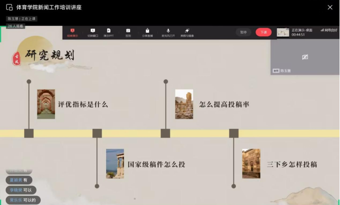 培训会上,陈玉慧从新闻稿的基本要求、格式、撰写等方面展开讲解,详细介绍了摄影技巧、宣传海报制作以及国家级投稿技巧与方法,并通过优秀新闻稿及摄影作品案例,带领参会学生干部了解新闻写作和摄影技巧的注意事项,强调稿件和照片内容应简洁明快,没有杂乱无关的信息,要体现新闻活动主体内容,凸显明确主题,具有代表性。在互动环节,她鼓励学生干部们多看,多思考,多积累,多写稿,把握新闻写作的内在规律,写出高质量的新闻作品。
